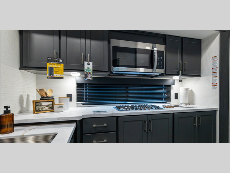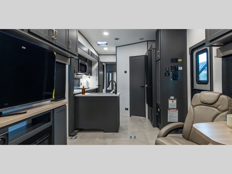 Sleeps 6 Slides 2 Length 34 ft 9 in Ext Width 8 ft 6 in Ext Height 12 ft 9 in Hitch Weight 1550 lbs GVWR 13550 lbs Dry Weight 8978 lbs Cargo Capacity 4572 lbs Fresh Water Capacity 140 gals Grey Water Capacity 65 gals Black Water Capacity 40 gals Fuel Capacity 40 gals Number Of Bunks 1 Available Beds King Refrigerator Type 12V Convection Cooking Yes Cooktop Burners 2 Number of Awnings 1 Garage Size 15 ft 1 in LP Tank Capacity 20 lbs Water Heater Type Tankless AC BTU 15000 btu TV Info LR Smart TV Axle Count 2 Number of LP Tanks 2 Shower Type Standard Similar Floorplans