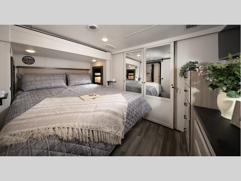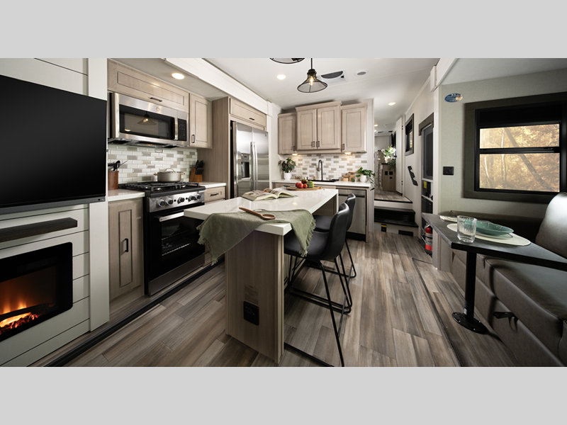 They come equipped with an impressive three 15,000 BTU A/C with quiet residential return air and a mandatory Four Seasons Package that will ensure your comfort year around, plus there are stainless steel kitchen appliances that give a residential touch to your space. The durable construction that includes a PVC roofing membrane will help extend the life of your fifth wheel, and the TravelLINK command system will put you in control of lighting, heating, and cooling for added convenience.