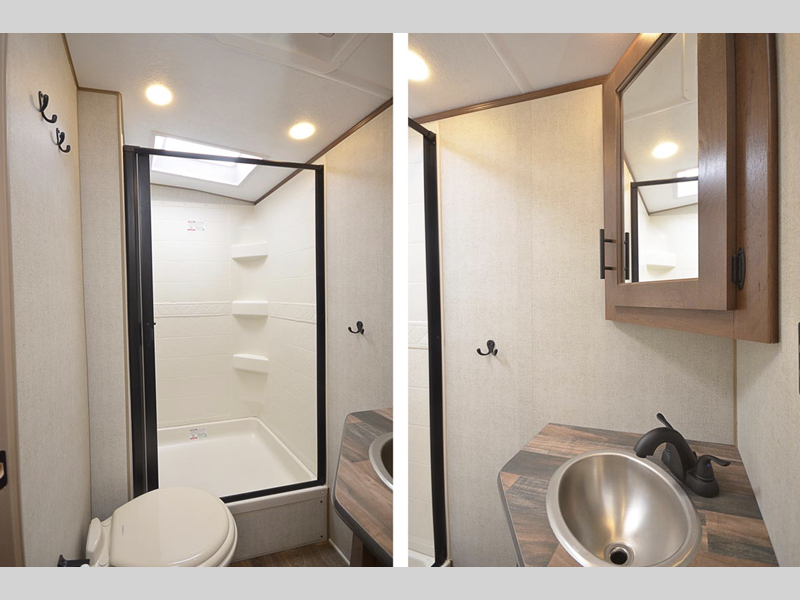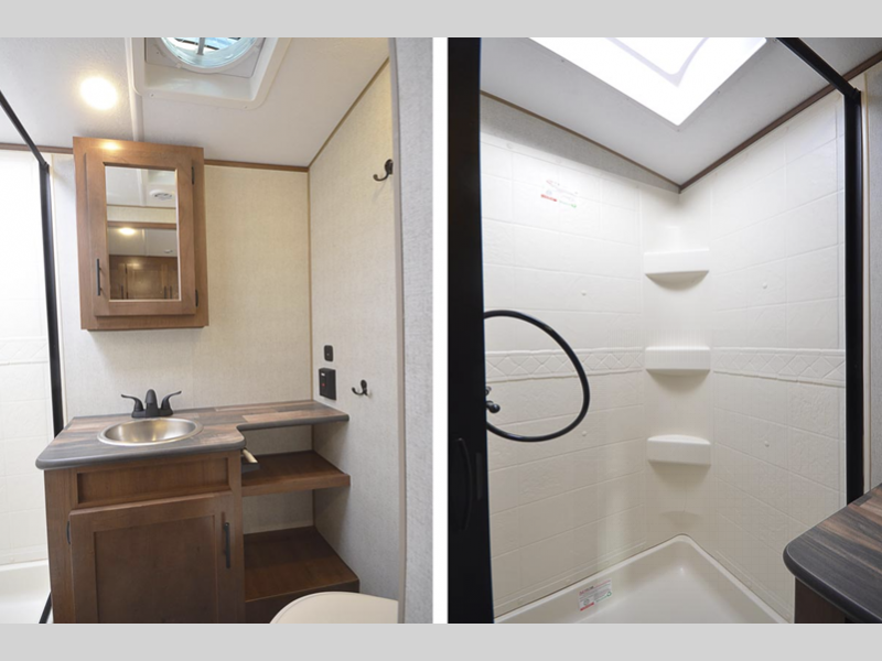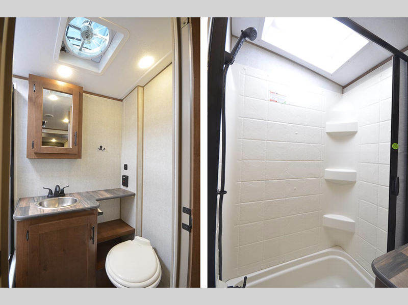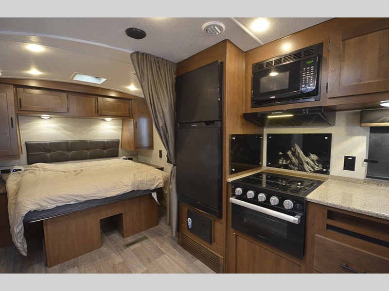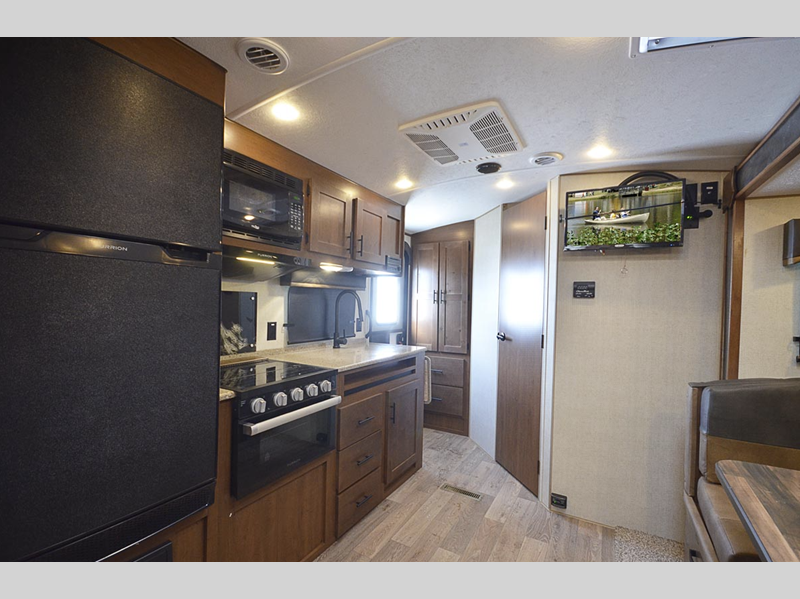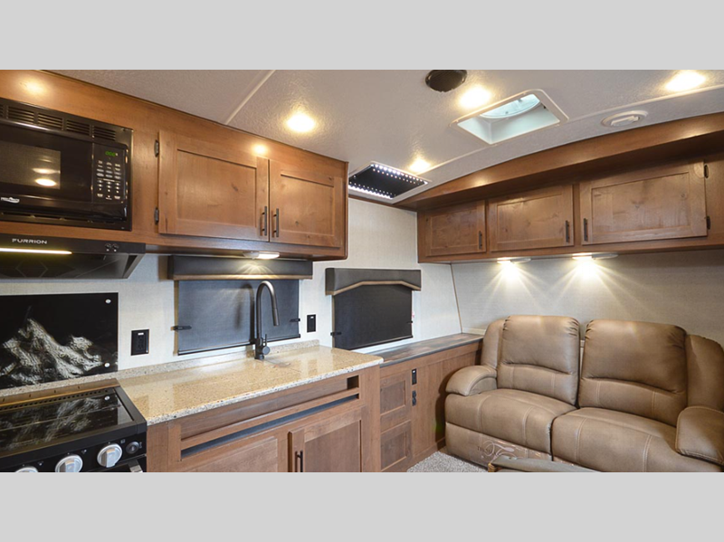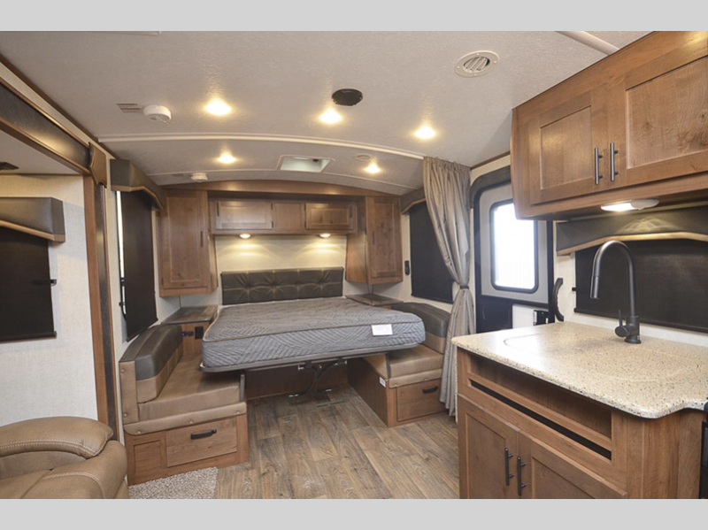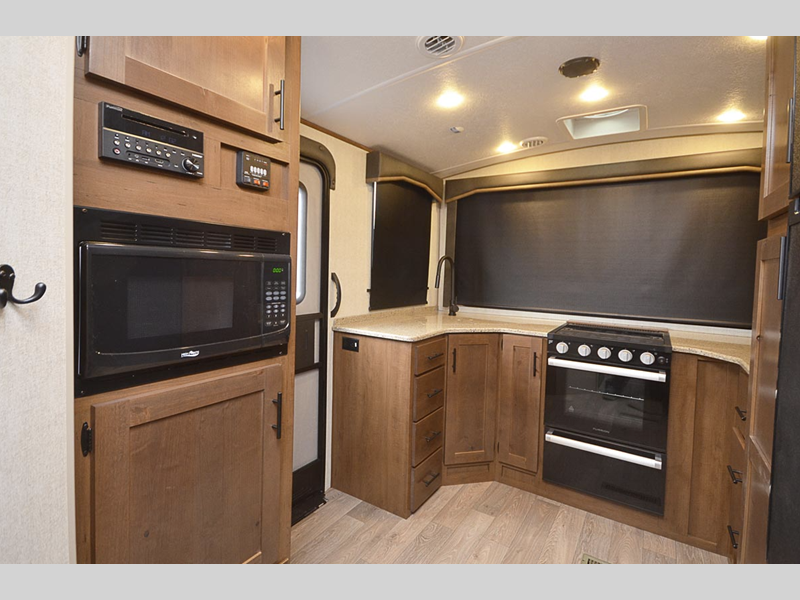 Inside, you'll find roto-torqued "Outdoors Tough" cabinetry, full extension 100 lb. metal drawer guides, and LG solid surface countertops. The rugged fiberglass front cap features lower diamond plate rock protection, and the integrated A-frame chassis construction adds durability. Full bath and kitchen amenities come standard on these travel trailers, as well as comfortable sleeping arrangements and plenty of storage space.