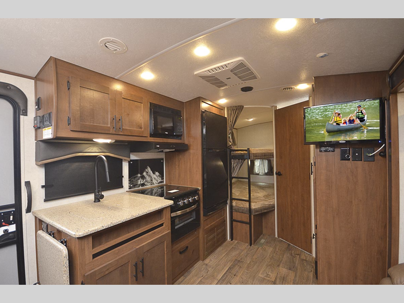 Sleeps 7 Slides 1 Length 26 ft 9 in Ext Width 8 ft Ext Height 11 ft 4 in Int Height 6 ft 11 in Hitch Weight 650 lbs GVWR 8250 lbs Dry Weight 6100 lbs Cargo Capacity 2150 lbs Fresh Water Capacity 78 gals Grey Water Capacity 50 gals Black Water Capacity 40 gals Tire Size ST225/75/15E Furnace BTU 25000 btu Number Of Bunks 2 Available Beds Queen Cooktop Burners 3 Number of Awnings 1 Axle Weight 4000 lbs LP Tank Capacity 30 lbs Water Heater Capacity 6 gal TV Info LR 24" Swing Out TV Awning Info 19' Axle Count 2 Number of LP Tanks 2 Shower Type Standard Similar Floorplans