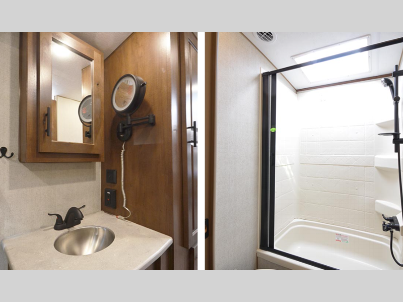 Sleeps 8 Slides 1 Length 28 ft 10 in Ext Width 8 ft Ext Height 11 ft 7 in Int Height 6 ft 11 in Interior Color Sandstone, Stone Basin Hitch Weight 850 lbs GVWR 9995 lbs Dry Weight 7280 lbs Cargo Capacity 3195 lbs Fresh Water Capacity 80 gals Grey Water Capacity 80 gals Black Water Capacity 40 gals Tire Size ST235/80/16E Furnace BTU 35000 btu Number Of Bunks 2 Available Beds Queen Refrigerator Type 12V Off Grid Refrigerator Size 10 cu ft Cooktop Burners 3 Number of Awnings 1 Axle Weight 5100 lbs LP Tank Capacity 30 lbs Water Heater Capacity 10 gal AC BTU 15000 btu TV Info LR 40" LED HD Awning Info 21' Axle Count 2 Number of LP Tanks 2 Shower Type Tub/Shower Combo Similar Floorplans